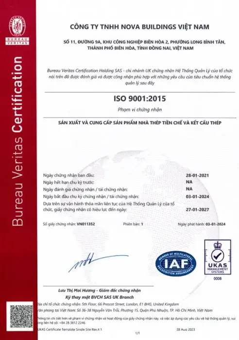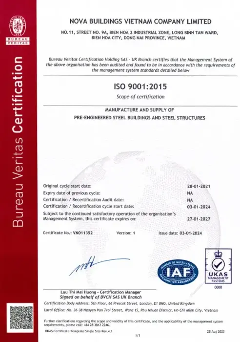 Nova Buildings Indonesia menerapkan sistem pengendalian mutu yang ketat, didukung oleh sertifikasi ISO 9001:2015 sebagai jaminan kualitas di setiap tahap produksi.