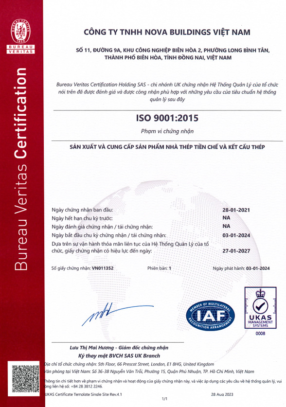 Every project delivered in Thailand and beyond is backed by rigorous engineering standards and quality assurance practices. Nova Buildings Group is proud to be ISO 9001:2015 certified, reinforcing our commitment to safety, reliability, and excellence.